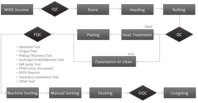 Top fastener production technology and advanced equipment, many imported high-speed cold heading equipment and automatical defectived testing equipment.